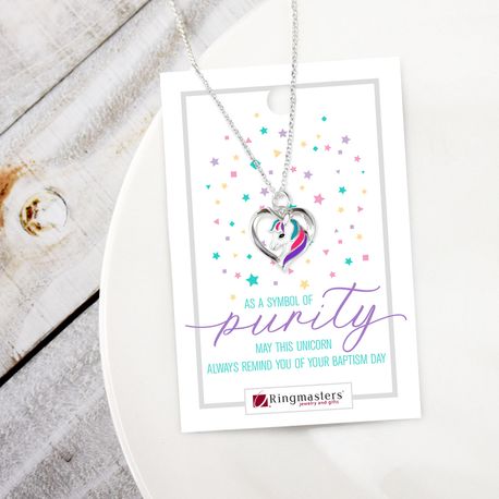 "As a symbol of purity may this unicorn always remind you of your baptism day." Enamel Unicorn pendant is approx. 16mm and comes on a 14-16" chain.