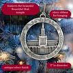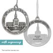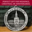 This keepsake ornament proudly displays the beautiful temple in an antique silver finish. The ornament is 3" inches in diameter and features a silver string attachment to hang on your Christmas tree or a chrome plated ornament stand also available from Ringmasters. Perfect for weddings or anniversaries, bring this beautiful temple ornament into your home.