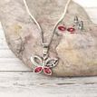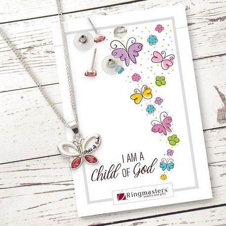 This adorable necklace is approximately 3/4" and includes two vibrate pink stones. Engraved on the butterfly are the words "Child of God". The set is completed with a set of pink stone earrings. Makes a perfect gift for... Just Because Baptism Convert Baptism Birthday Young Women advancement and much more
