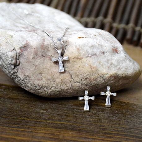 Silver cross necklace and earring set with clear baguette stones Silver finish Earrings and necklace charms are approximately 1/2" The necklace is on an 18 - 20" adjustable chain.