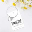 Endure Bracelet. Endure: To withstand with courage Endure to the end Silver finish adjustable bangle bracelet with endure, arrow, and clear stone charms.