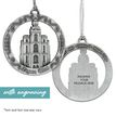 This keepsake ornament proudly displays the beautiful temple in an antique silver finish. The ornament is 3" inches in diameter and features a silver string attachment to hang on your Christmas tree or a chrome plated ornament stand also available from Ringmasters. Perfect for weddings or anniversaries, bring this beautiful temple ornament into your home.