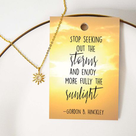 "Stop Seeking out the Stars and Enjoy more fully the Sunlight". - Gordon B. Hinckley Brighten your days with this simple but beautiful Sun charmed Sunlight Necklace. The pendant is aprox. 3/4". Gold necklace can adjust to 18-20" on a link chain. Comes with a lifetime warranty.