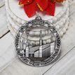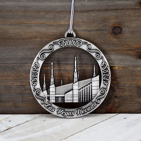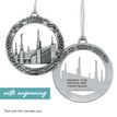 This keepsake ornament proudly displays the beautiful temple in an antique silver finish. The ornament is 3" inches in diameter and features a silver string attachment to hang on your Christmas tree or a chrome plated ornament stand also available from Ringmasters. Perfect for weddings or anniversaries, bring this beautiful temple ornament into your home.
