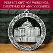 This keepsake ornament proudly displays the beautiful Meridian Idaho temple in an antique silver finish. The ornament is 3" inches in diameter and features a silver string attachment to hang on your Christmas tree or a chrome plated ornament stand also available from Ringmasters. Perfect for weddings or anniversaries, bring this beautiful temple ornament into your home.