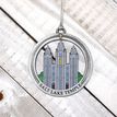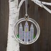 This keepsake ornament proudly displays the beautiful temple in an antique silver finish. The ornament is 3" inches in diameter and features a silver string attachment to hang on your Christmas tree or a chrome plated ornament stand also available from Ringmasters. Perfect for weddings or anniversaries, bring this beautiful temple ornament into your home.