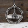 This keepsake ornament proudly displays the beautiful temple in an antique silver finish. The ornament is 3" inches in diameter and features a silver string attachment to hang on your Christmas tree or a chrome plated ornament stand also available from Ringmasters. Perfect for weddings or anniversaries, bring this beautiful temple ornament into your home.