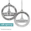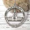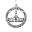 This keepsake ornament proudly displays the beautiful temple in an antique silver finish. The ornament is 3" inches in diameter and features a silver string attachment to hang on your Christmas tree or a chrome plated ornament stand also available from Ringmasters. Perfect for weddings or anniversaries, bring this beautiful temple ornament into your home.