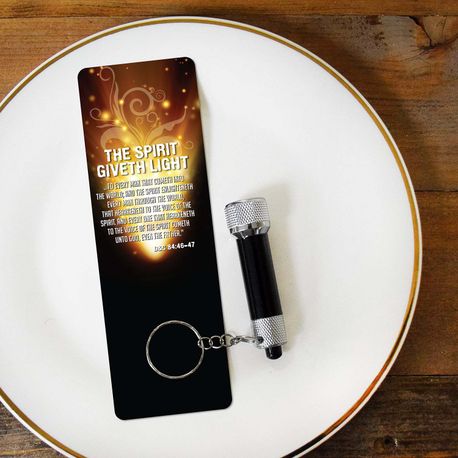 The flashlight key chain is approximately 2 1/2" and includes batteries. Bookmark is printed on quality cardstock and is 2x6" "And the Spirit giveth light to every man that cometh into the world; and the Spirit enlighteneth every man through the world, that hearkeneth to the voice of the Spirit. And every one that hearkeneth to the voice of the Spirit cometh unto God, even the Father." D&C 84:46-47