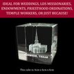 This beautiful laser engraved crystal cube makes for a perfect wedding or anniversary gifts. Together with a lighted rotating base, these 3D pieces of art make for a great decoration on a table or shelf. Each cube is packaged in a beautiful velvet-lined gift box. Over 30 temples are available for members across the United States and Canada. This cube is: 6cm x 6cm x 6cm.