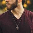 Striking large cross necklace. Silver and black cross pendant approximately 1 3/4" on a black ball chain. Chain length is 22" but can be trimmed to any size.