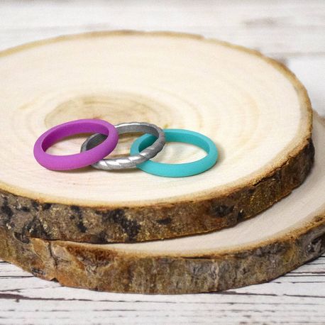These stackable silicone rings are perfect for anybody! Lightweight and flexible, they go with anything. One light blue, one purple, and one silver with rope texture perfect to mix and match, or wear separately!