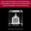 This beautiful laser engraved crystal cube makes for a perfect wedding or anniversary gifts. Together with a lighted rotating base, these 3D pieces of art make for a great decoration on a table or shelf. Each cube is packaged in a beautiful velvet-lined gift box. Over 30 temples are available for members across the United States and Canada. This cube is: 6cm x 6cm x 6cm.