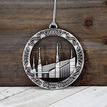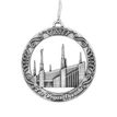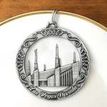 This keepsake ornament proudly displays the beautiful temple in an antique silver finish. The ornament is 3" inches in diameter and features a silver string attachment to hang on your Christmas tree or a chrome plated ornament stand also available from Ringmasters. Perfect for weddings or anniversaries, bring this beautiful temple ornament into your home.
