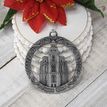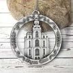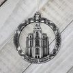 This keepsake ornament proudly displays the beautiful temple in an antique silver finish. The ornament is 3" inches in diameter and features a silver string attachment to hang on your Christmas tree or a chrome plated ornament stand also available from Ringmasters. Perfect for weddings or anniversaries, bring this beautiful temple ornament into your home.