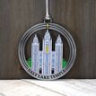 This keepsake ornament proudly displays the beautiful temple in an antique silver finish. The ornament is 3" inches in diameter and features a silver string attachment to hang on your Christmas tree or a chrome plated ornament stand also available from Ringmasters. Perfect for weddings or anniversaries, bring this beautiful temple ornament into your home.