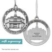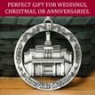 This keepsake ornament proudly displays the beautiful temple in an antique silver finish. The ornament is 3" inches in diameter and features a silver string attachment to hang on your Christmas tree or a chrome plated ornament stand also available from Ringmasters. Perfect for weddings or anniversaries, bring this beautiful temple ornament into your home.
