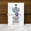 Just baptized and armed with the shield of faith 2" tiebar Makes a good baptism momento Comes on a cute packaging card to make the perfect gift. From Ringmasters. The world leader in gifts for members of the Church of Jesus Christ of Latter-day Saints